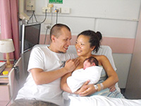出産12時間後に病室にて。帝王切開でも動いた方が良いとシャワーを浴びてリフレッシュした後です。 2014年3月8日更新